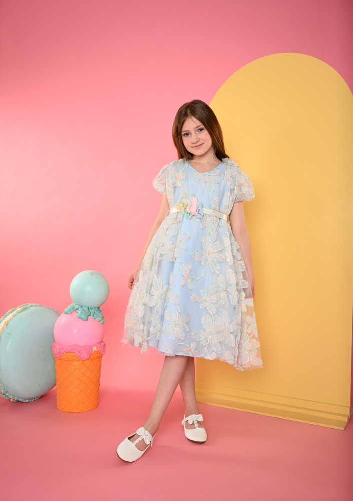 - التصميم: تصميم فستان اطفال باللون السماوي بقصة منفوشة من التل، يمنح الطفلة مظهراً احتفالياً وحالماً، مع تفاصيل زخرفية ناعمة.
